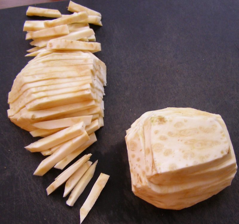 - 3 cups celery root --julienne, cooked or steamed until crisp-tender