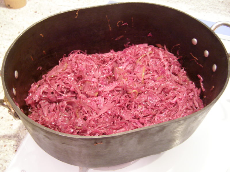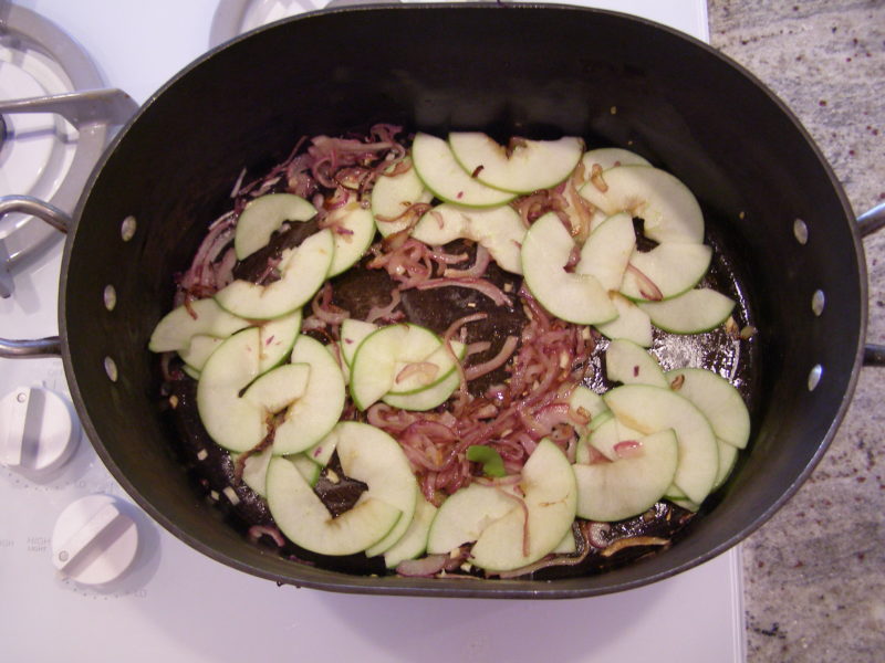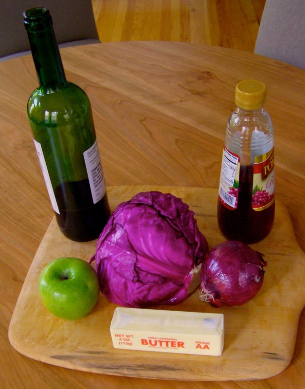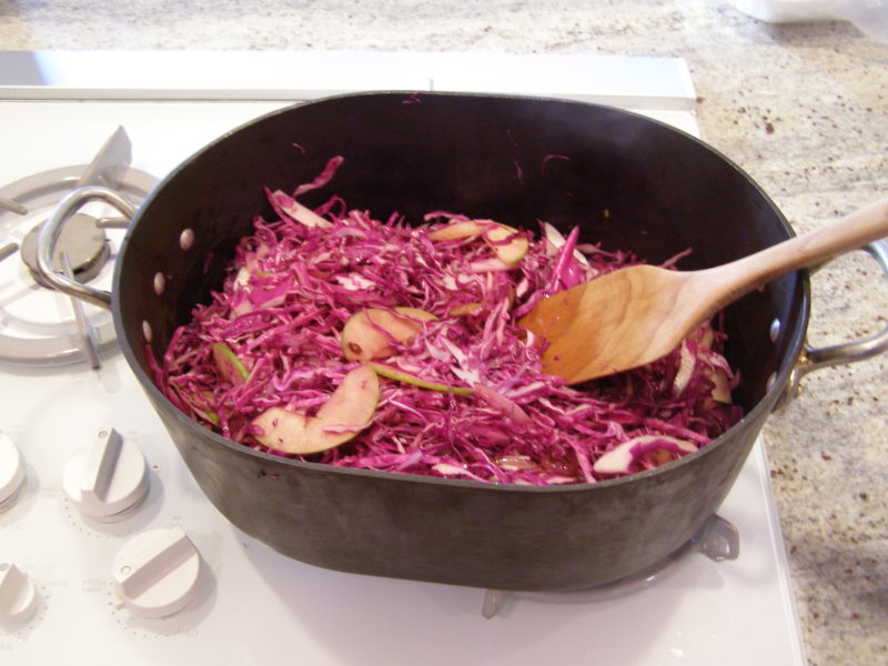- Preheat oven to 325 degrees. Using a ovenproof large pot, heat the olive oil and butter over medium heat on a stovetop. Add the sliced red onion and ½ t. of salt. Cook for about 5 minutes, stirring frequently. Add the minced garlic and cook an additional minute, stirring occasionally. Add the sliced green apple and cook 1 more minute. Add the cabbage, stirring well to mix together ingredients,. Pour in red wine, chicken stock, and red wine vinegar, stirring well. Cover the pot and place in oven.