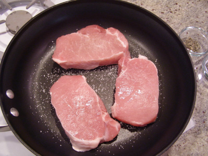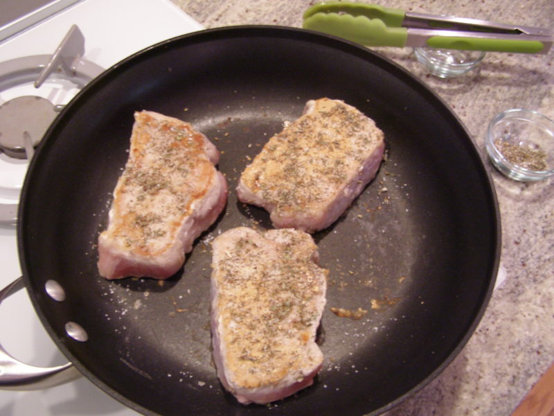 Robertson’s technique of browning the pork chops in dry skillet seasoned with kosher salt was intriguing to me. I debated whether to season the chops with the herb and spice mixture before browning, but finally decided to give her method a try.