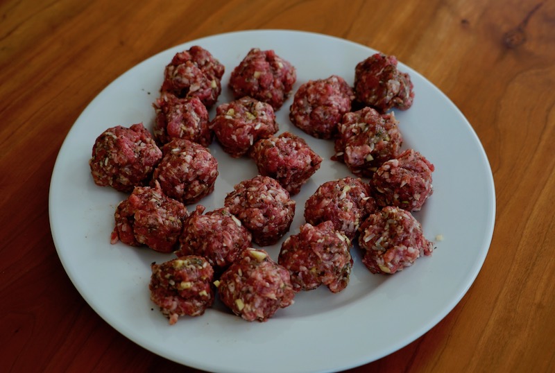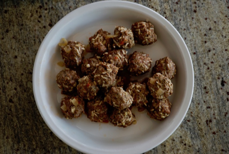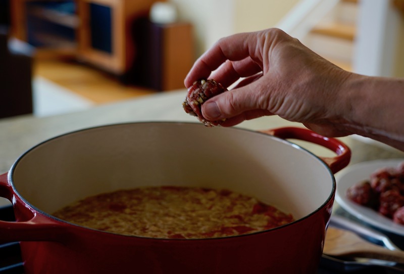 I adapted Medina’s recipe, using equal proportions of ground beef and pork, and changing the technique for cooking the meatballs a bit.