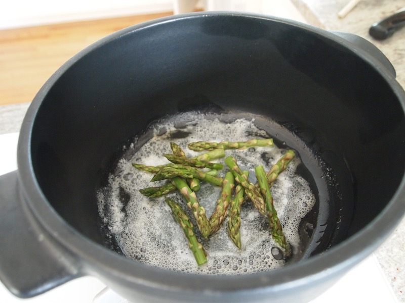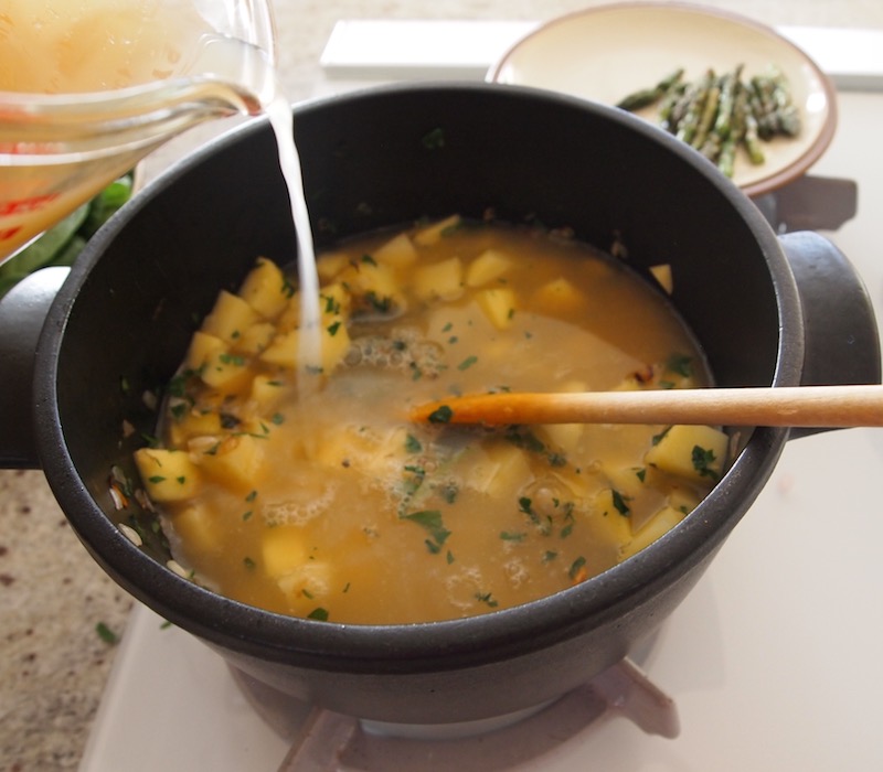 - When the broth is boiling, add the ½-inch asparagus stalk pieces. Lower the heat to simmer, partially cover the pot, and cook for 20-30 minutes, or until the asparagus stalk pieces and potatoes are very tender.