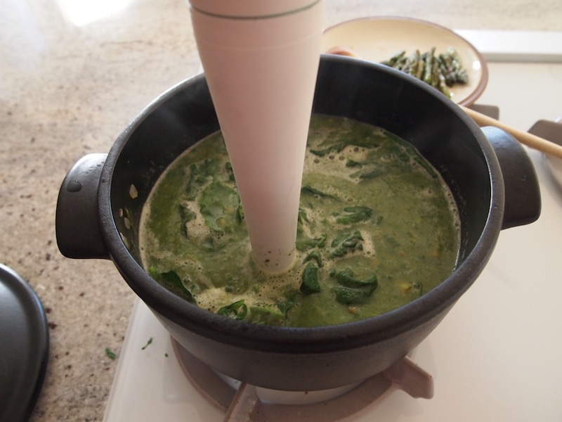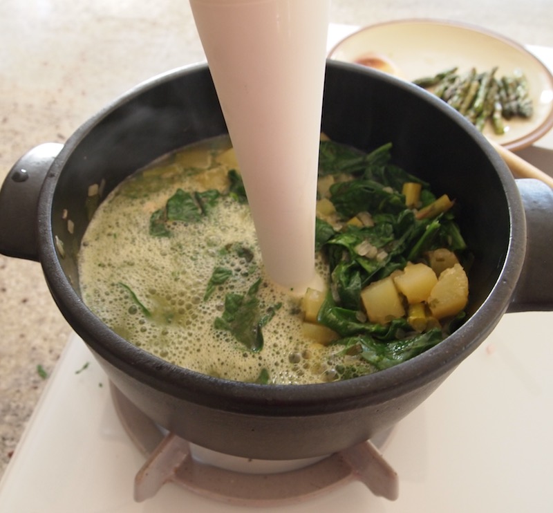 However, I also saw reasons to make a few changes to the original recipe. It called for simmering the fresh greens for 20-30 minutes. Cooking spinach that long seemed unnecessary and a guarantee of losing the vibrant green color I was aiming for. The directions also called for a whole cup of whipping cream to finish off the soup. I felt I could use much less cream since the potatoes within the broth would add a velvety texture.