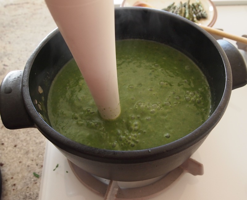 When I noticed that the recipe lacked the use of any aromatics for flavoring or incorporating the tips of the asparagus stalks in the recipe, I turned to some British chefs for advice. First, a soup at the BBC’s website Good Food suggested using briefly cooked asparagus tips as a garnish for the soup. I like the idea of garnishes hinting at what hides within a creamy soup.