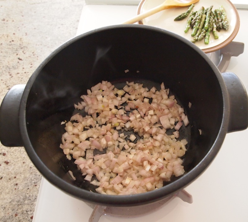 I also read in Nigel Slater’s great book Tender: A Cook and His Vegetable Patch that using butter instead of oil to sauté spinach helps to eliminate what he calls the “furry teeth” sensation some folks get when eating cooked spinach. Since I was planning to add some shallots to the recipe, I figured I could sauté the asparagus tips in butter, and then add the shallots, building the soup from there. I would have my garnish and my aromatics without any extra mess!