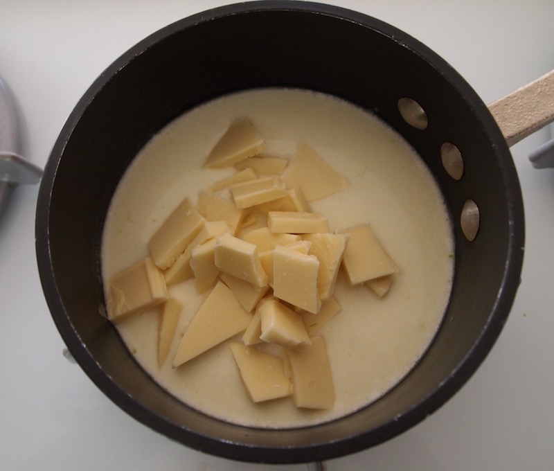 The recipe starts with a white chocolate base that is briefly cooked in order to melt the chocolate. (The original recipe called for 6 ounces of white chocolate, but I discovered that my pantry had only a 4 ounce bar. I think it worked just fine.)