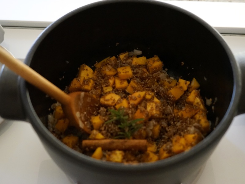 Pumpkins decorating porches and leaves turning red and orange announce that fall is here. As the days grow shorter, I look for foods that are comforting and warm. This pilaf, easily put together in a short amount of time, is a welcome autumn addition to our table. Studded with cubes of butternut squash and bright notes of dried cranberries, it can bring a cheery note to a simple dinner. The whole herbs and spices that go into the pilaf fill the kitchen with the smells of pumpkin pie and a winter roast, but with a brief cooking time, do not overpower the flavor of the dish.