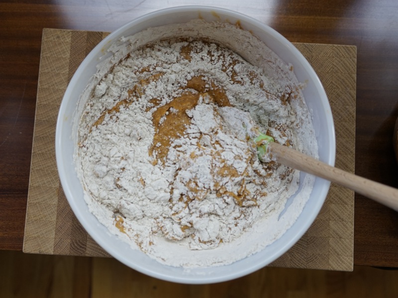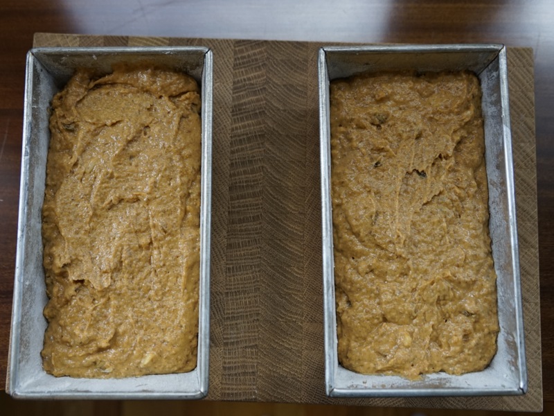 Harrison suggested adding the buttermilk and oil after combining the dry ingredients with the pumpkin, eggs, and sugar; I changed that approach to keep all wet ingredients together and allow the bran cereal to soak in this mixture before adding it to the dry ingredients. This method keeps the loaves from toughening up due to over-beating. It also ensures that the oil is well combined within the wet ingredients and helps the softened bran to be evenly distributed into the batter.