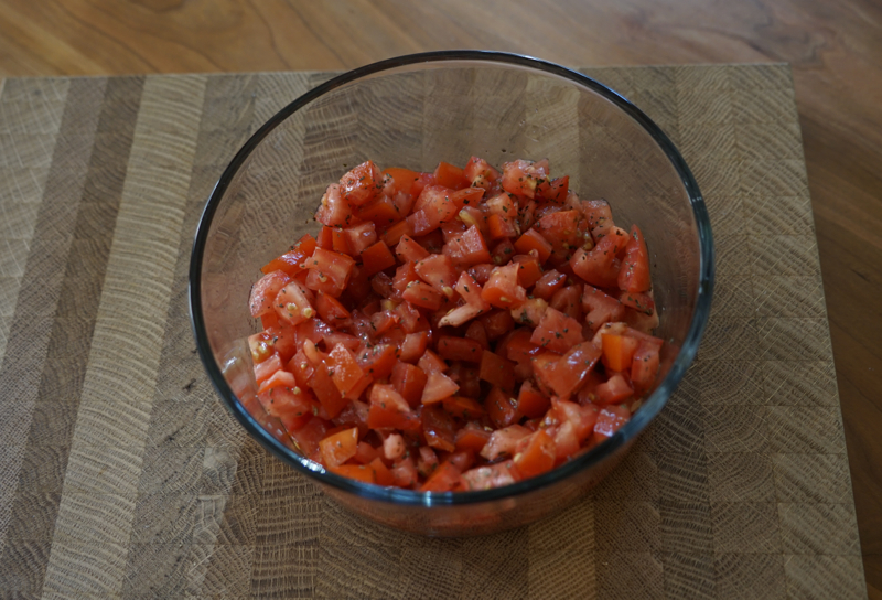 That fancy word concassé is a French term for fresh tomatoes that have been peeled, seeded, and finely diced. Mandel suggested—and I took—the easy route and skipped the step of peeling. We loved the result.