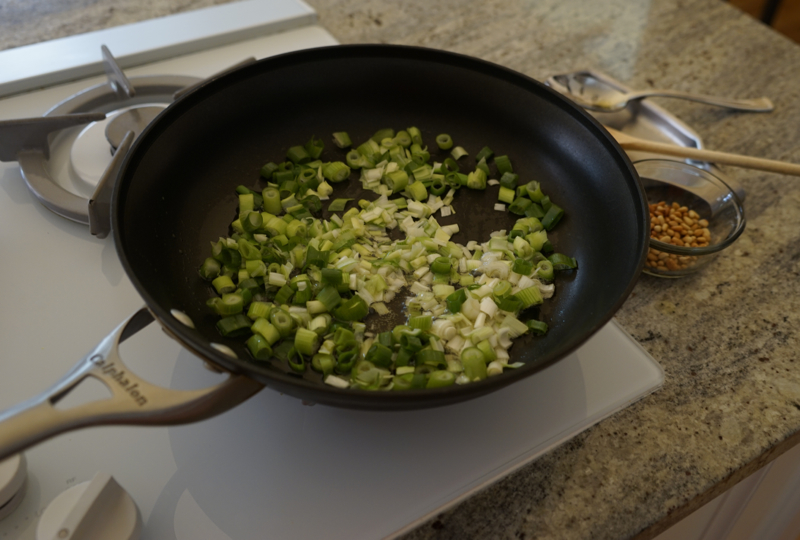 - Reduce heat to medium low and add green onions to remaining warm oil in skillet. Cook for about 4 minutes, stirring occasionally. Add garlic and cook 1 additional minute.