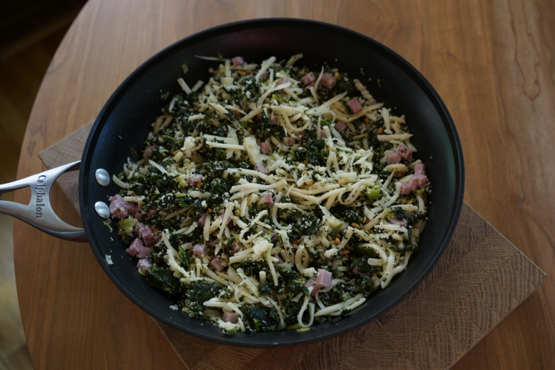 - Add ham, bread crumbs, grated cheese, and pine nuts to spinach mixture. Stir to combine.