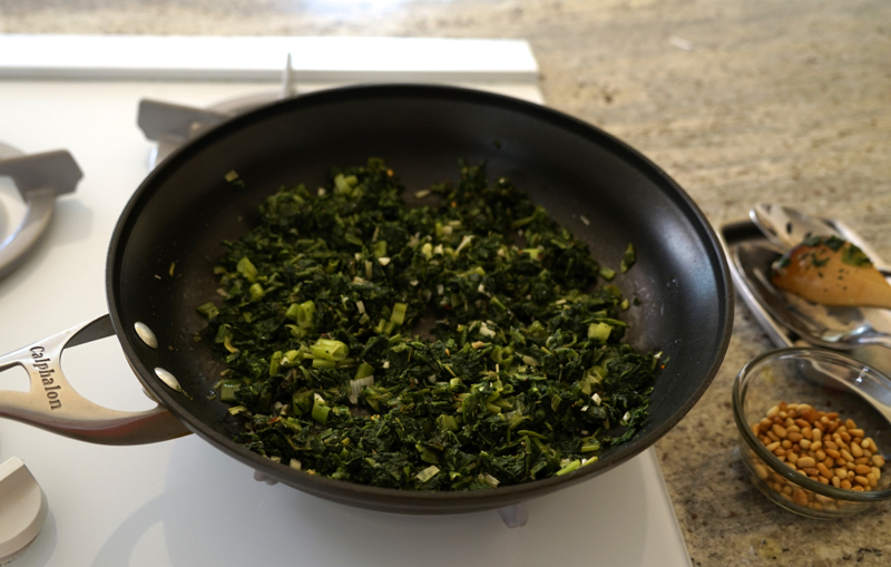 The whole dish comes together pretty easily. While the water heats for boiling the pasta, you can stir together the ingredients for the filling. Mandel called for grinding stale bread slices for the stuffing in a food processor, but I decided to use panko crumbs instead. I changed up the cooking order a bit, giving the green onions a few more minutes of time in the skillet to become sweet and soft before adding the garlic and then the spinach. Mandel’s recipe created enough shells for 4 servings, but I increased volumes of ingredients to serve 6.