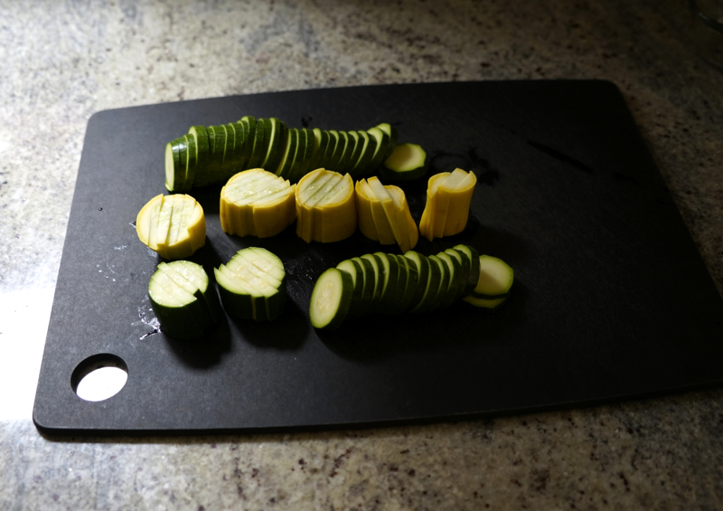 - Cut squash into 1/8-inch slices, some lengthwise and some cross-wise. (I used inch-long sections for the lengthwise cuts.)