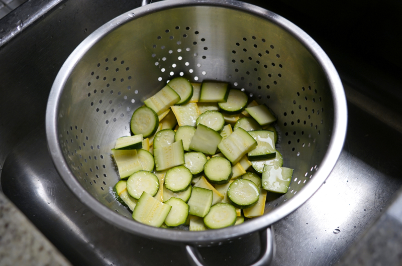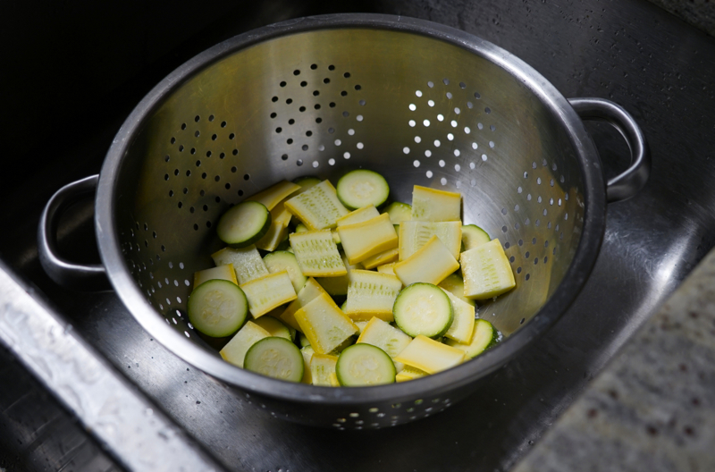 - Let the squash sit in the colander undisturbed for about 30 minutes while you prepare the quinoa. It will “sweat” out extra moisture and become slightly wilted in appearance, but still be brightly colored.