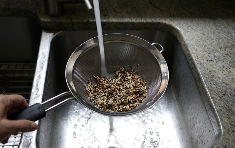 - Drain the quinoa in the same sieve you rinsed it in and return it to the hot saucepan. Cover the pan and allow to sit for 15 minutes. Uncover the pan, fluff the quinoa with a fork and let cool.
