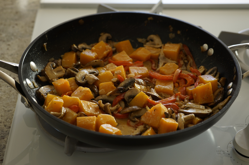 - Add pumpkin/squash cubes to skillet and stir. Cook for one minute.