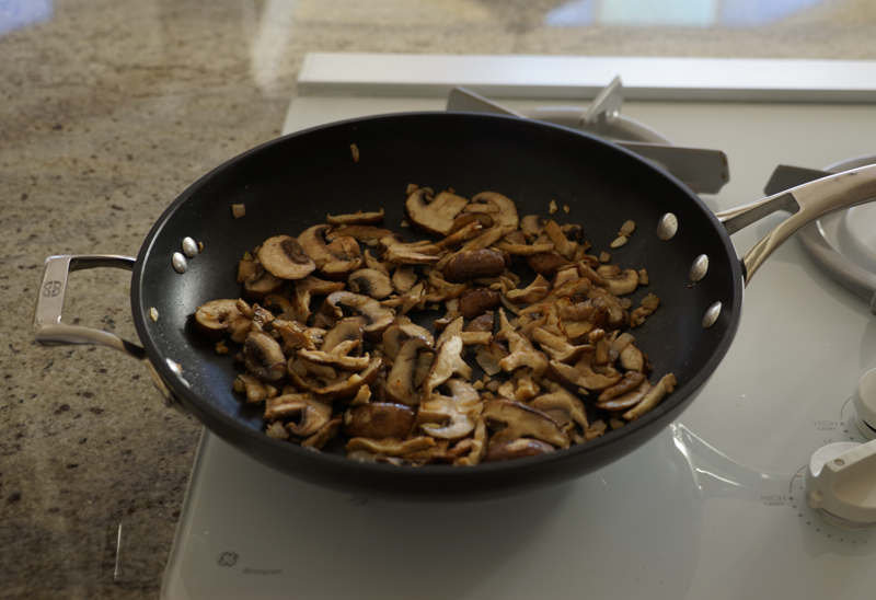 The restaurant’s technique looked pretty simple, but the portions were huge—a pound of pasta for 4 appetizer servings! I decided to use half that amount of pasta, but to keep the same number of vegetables in the dish. I also amped up the shallots and garlic that create the sauce base, used a variety of mushrooms, and decreased the amount of butter and cream used in the original.