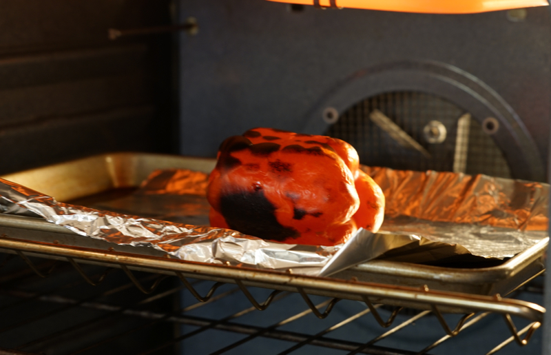 - Char pepper in broiler (or over gas flame) until blackened on all sides. Place inside a plastic or paper bag and seal. Allow to stand 10 minutes at room temperature to steam. Remove charred peel, membranes and seeds inside, and cut into very thin strips.