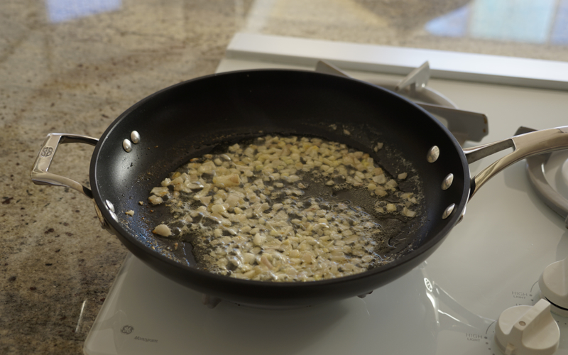 - Heat butter and olive oil together in large skillet over medium heat. Add shallot and cook, stirring for about 3 minutes. Add garlic and cook an additional minute.