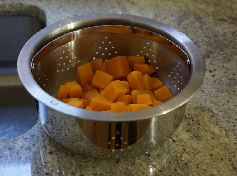 - Steam pumpkin/squash cubes until tender, about 10 minutes (may take longer). Set aside.