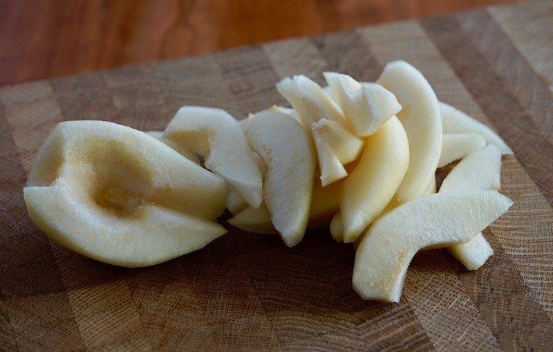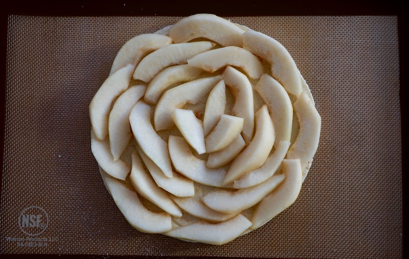 - Peel, core, and slice the pears into about 1/4 inch wedges. Arrange the wedges on the tortilla, starting at the outer edge with the thicker part of the wedge facing out. Continue making slightly overlapped circles, moving toward the center of the tortilla with each round. End with a few pear pieces in the center of the tortilla so that the pattern resembles a rose.