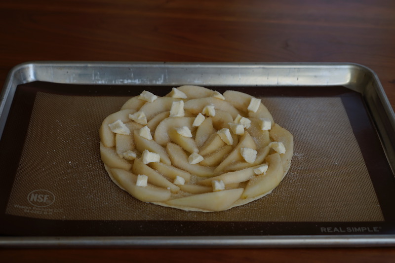 Jacques Pepin has a gift for making food beautiful. He recommends arranging the slices of pear into the shape of a rose. Starting from the outer edge of the crust, you simply place the wedges with their thin sides towards the center. Once you’ve filled it all in, it does resemble a delicate flower. Another magical touch.