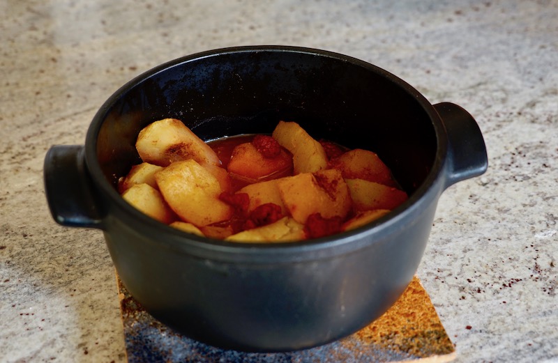 I also opted to heat the ingredients on the stovetop before placing the lid on the casserole dish and baking the apple mixture. Having a pot that can be used both on top of the stove as well as in the oven is important for this step. But it is a one-pot dessert, and that is always a plus!