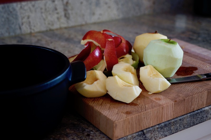- Peel and core apples. Cut apples into quarters and drop into saucepan, tossing with citrus juices.