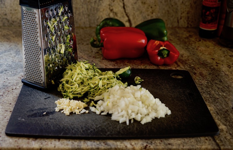 I also used a mix of red and green bell peppers, as my refrigerator had a few of each waiting for a role in a starring dish. (Krieger called for red peppers only.) When I was growing up, we often had stuffed green bell peppers filled with a rice and ground beef mix. My mom cut the crowns off of the peppers and simmered them on the stove upright in a bit of water so that they could steam and cook. They were little Cajun cups of goodness. For this recipe, I cut the peppers lengthwise and laid them flat in a casserole to bake in the oven. I found that a grapefruit knife, with its curved blade, was the perfect tool to remove the peppers’ ribs.