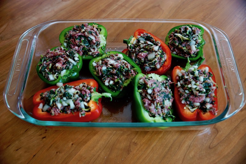 These peppers are adapted from Greek-Style Stuffed Peppers by Ellie Krieger, a recipe found in her cookbook The Food You Crave. I upped the amounts of spinach, oregano, and feta that Krieger used and added garlic and red chili flakes to further flavor the filling.