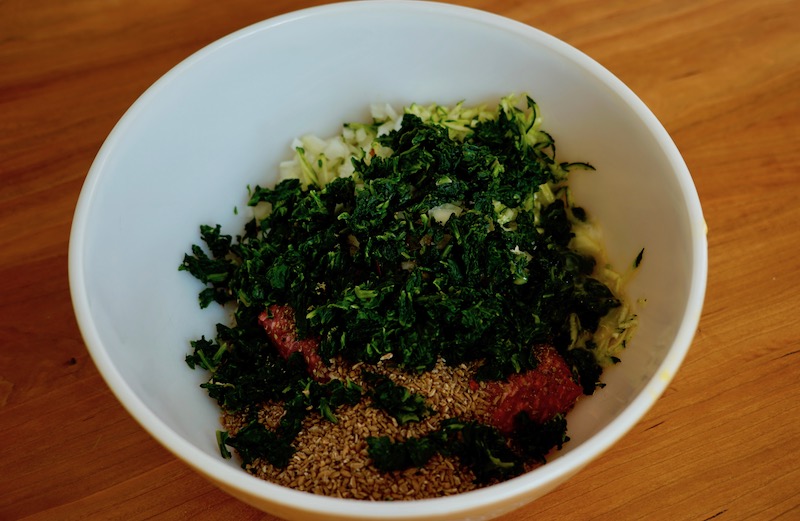 - Using a large bowl, combine the ground beef, spinach, zucchini, onion, garlic, bulgur, egg, oregano, chili flakes, salt, and black pepper. Mix well with your hands, making sure to distribute vegetables and bulgur well.