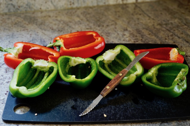 - Cut peppers lengthwise, preserving the stem end but carefully removing the core, seeds, and ribs.