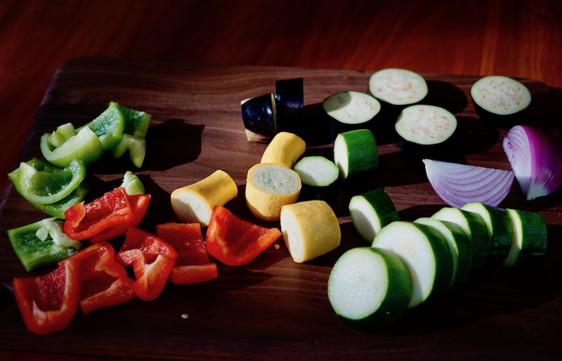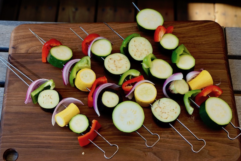 What I liked about this recipe, which I scaled down for two, is that one eggplant, one zucchini, and some other random vegetables from my refrigerator could contribute enough to make handsome and really tasty kebabs. Resnik suggested using pearl onions and pattypan squash, which required precooking before going on the grill. I wanted to simplify the recipe and avoid using the stovetop. (Also, I omitted the large mushrooms she suggested, only because I had none.) So I changed up the vegetables in the kebab lineup to match what I had on hand. Summer squash, red and green peppers, red onion, and the eggplant created a multihued combination.