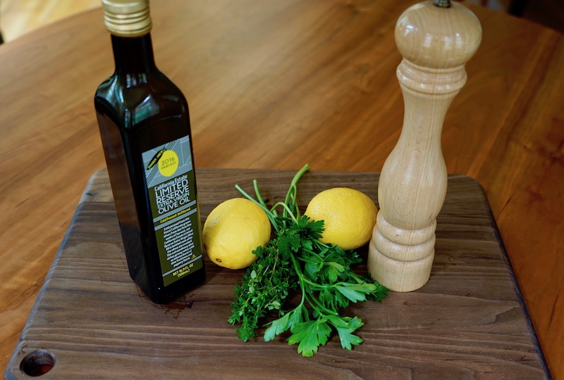 - Whisk together the olive oil, lemon juice, minced herbs, lemon zest, and pepper in small bowl. Pour half of the mixture into another bowl and set aside.