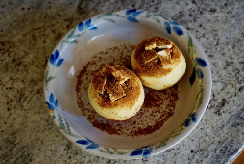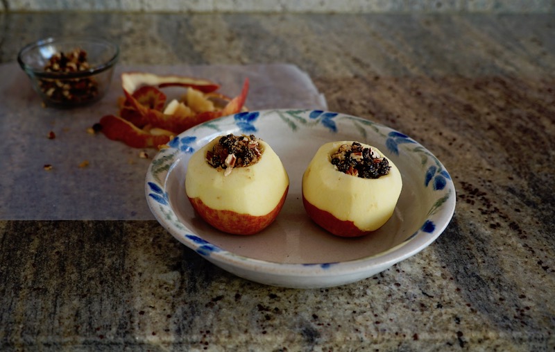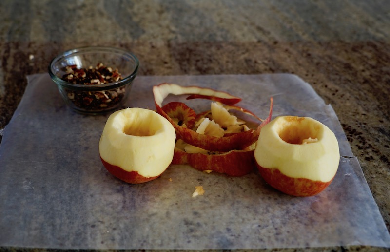As you core the apples to create a space for the filling, you have to be careful to avoid piercing the bottom of the fruit. I used a paring knife to remove most of the core and widen the opening to make room for filling, then used a spoon to scrape the bottom-most seeds out. Next I peeled the skin from the top of the apple to allow it to soak in the basting sauce while in the oven.