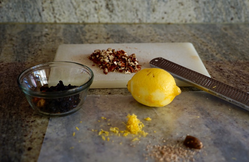 - Chop pecans into small pieces. Place brown sugar in small bowl and break up with fork . Mix with pecans, currants, lemon zest, cinnamon, and nutmeg. Set aside.