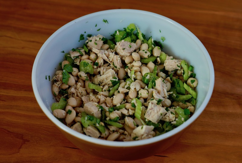 The magazine’s food writers simplified Mullen’s technique by using canned beans instead of cooking dried ones. I almost always have canned white beans and tuna on hand in my pantry, which makes a quick first step in preparation. To Mullen’s simple celery and parsley, I added some chopped green onion to widen the flavor profile and fresh wedges of tomatoes, for both color and taste.