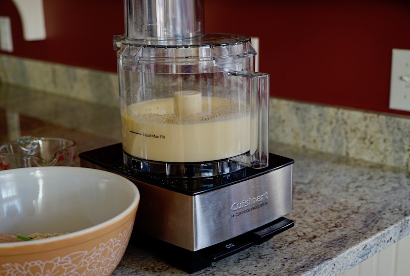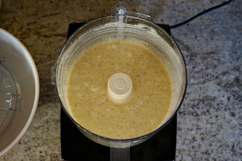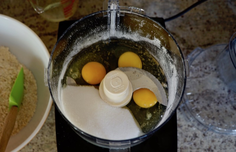 - Place the eggs and sugar in the bowl of the processor and process for 2 minutes. The mixture will become a pale yellow. Once the 2 minutes have passed, and while the processor is still running, pour a steady stream of the melted butter and oil through the feed tube into the bowl, continuing to process until it is mixed well.
