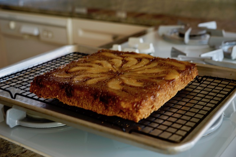 The cake bakes in a slow oven for over an hour, giving the raw pears a chance to become soft while their accompanying swirls of caramel cook into the cake layer. Once the cake has rested a bit to cool off, you invert the it to see the upside-down part right side up.