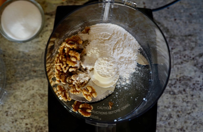 - Add the dry flour-walnut mixture from the bowl to the processor. Pulse 4-5 times to combine the wet and dry ingredients.