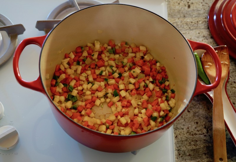The soup starts with diced onion, carrots, and celery root. While I frequently use celery stems in my soup bases, I found the root (or celeriac) to be especially flavorful. No doubt, it’s one of the ugliest vegetables in the produce bin, but underneath that bumpy brown exterior lies a white gem. The flesh of celeriac has the consistency of a potato, but a mild celery flavor, and after sautéing a bit, becomes both sweet and savory.