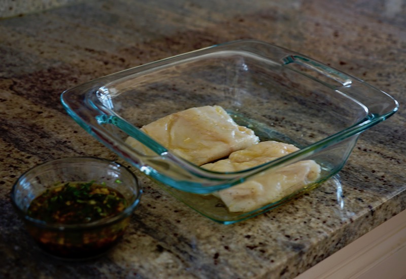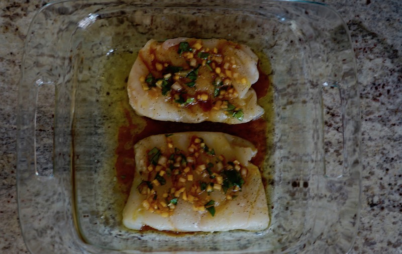 The fillets are coated with a bit of oil, salt, and pepper and then some of the ginger lime sauce before baking at a high temperature. While Dojny and Barnard recommended using only a half-tablespoon of the sauce atop each filet during the baking time, I doubled that.