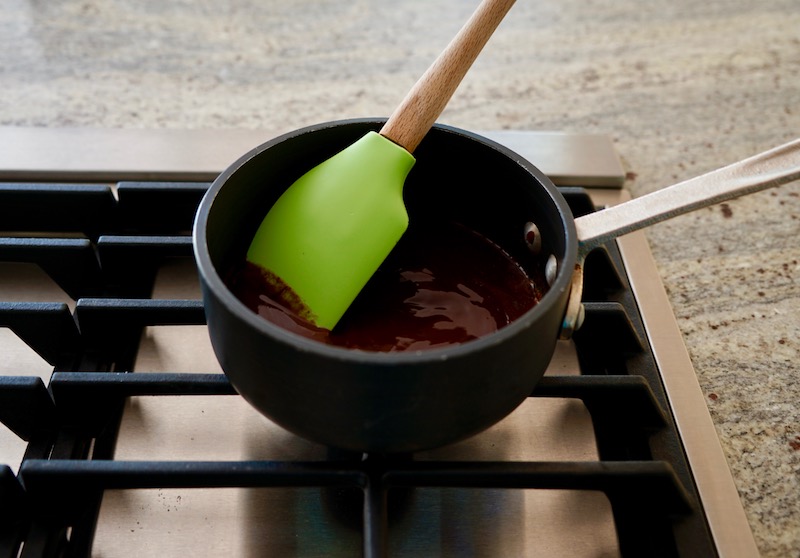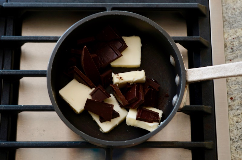 The brownies begin with melting butter and semisweet chocolate together over low heat until they become a smooth liquid.