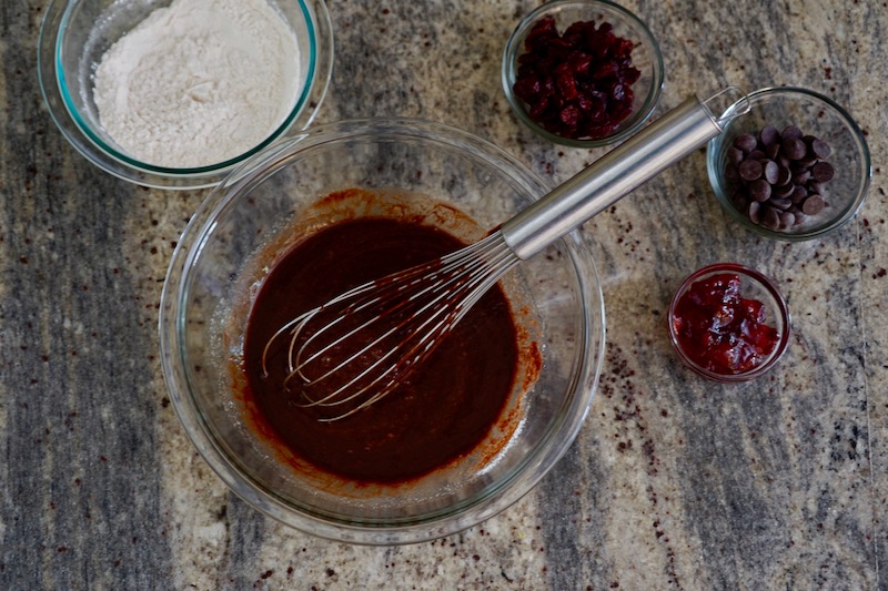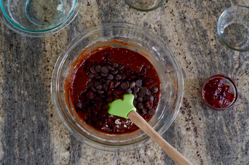 - Stir flour mixture into chocolate batter. When incorporated, add dried cherries, chocolate chips, and cherry preserves. Stir to mix and distribute well.