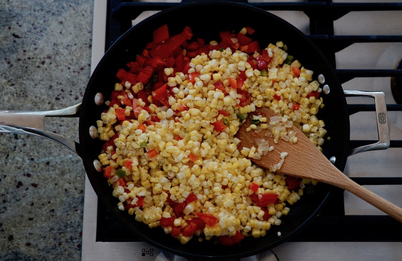 After the onions became silky and sweet, the peppers added the next layer of flavor. Once they softened, the freshly cut corn and chopped tomatoes went into the skillet with a bit of water.