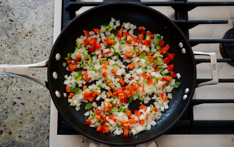 While I started my sautéing of vegetables with the typical Cajun onion for this version, I varied the peppers used. The usual choice is a green bell pepper, a workhorse of the Cajun trinity of seasonings. This time, I opted for a colorful red bell pepper along with an mildly spicy Anaheim chile.