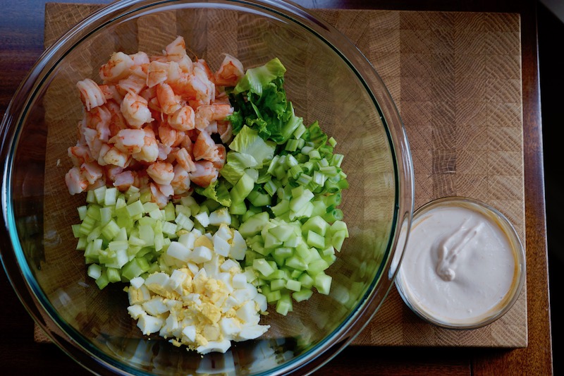 The variety of chopped vegetables and eggs in the salad brings both contrasting textures—a little crunch, a bit of give—and layers of flavor to it. The vegetables and eggs are chopped in smaller bits—about 1/4 inch in size, while the shrimp get chopped a bit bigger. Once combined, they’re ready for the salad’s dressing.