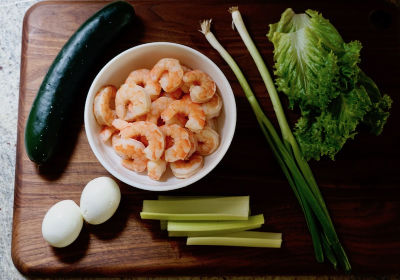 - Combine the chopped celery, cucumber, eggs, green onions, and torn lettuce pieces in a large bowl. Chop shrimp into 1/2-inch pieces (cutting each shrimp into 4 or five sections), add to bowl and mix gently.