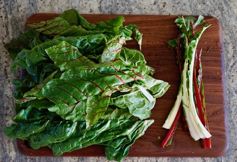 - Prepare the chard by trimming the stem ends and discarding them.Then trim the leaves from the large center stems. Set the stems aside and pile up the leaves. Slice the stems into 1/2-inch pieces. Pile 4-5 leaves on top of each other, roll tightly, then slice into 1 inch ribbons. Repeat with the remaining leaves. Cut the strips of leaves again sideways so that they are roughly 1- by 3-inch rectangles.