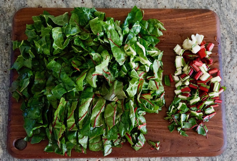 - Prepare the chard by trimming the stem ends and discarding them.Then trim the leaves from the large center stems. Set the stems aside and pile up the leaves. Slice the stems into 1/2-inch pieces. Pile 4-5 leaves on top of each other, roll tightly, then slice into 1 inch ribbons. Repeat with the remaining leaves. Cut the strips of leaves again sideways so that they are roughly 1- by 3-inch rectangles.