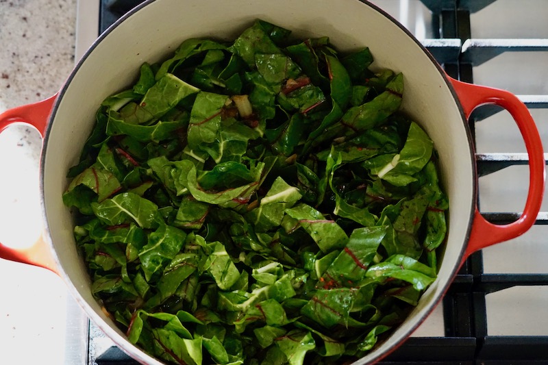 What looks like a full pan of fresh leaves quickly cooks down into a thin layer of flavorful green and red.